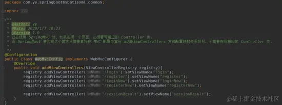 WebMvc配置类,用于重写addViewControllers方法配置映射关系,实现页面路由: