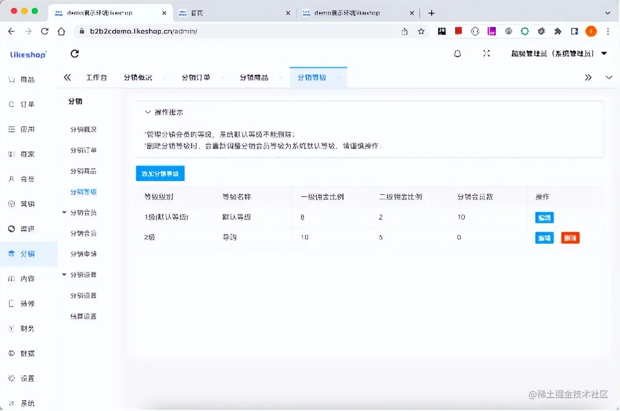 分销等级可以删除,系统默认的分销等级则不能删除。删除分销等级时,会重新调整分销会员等级为系统默认分销等级,请谨慎操作。