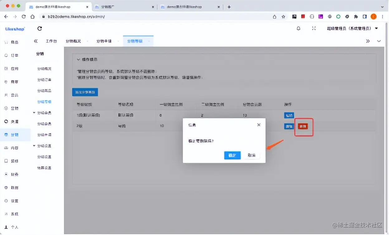 (多商户商城系统-平台端删除分销等级)