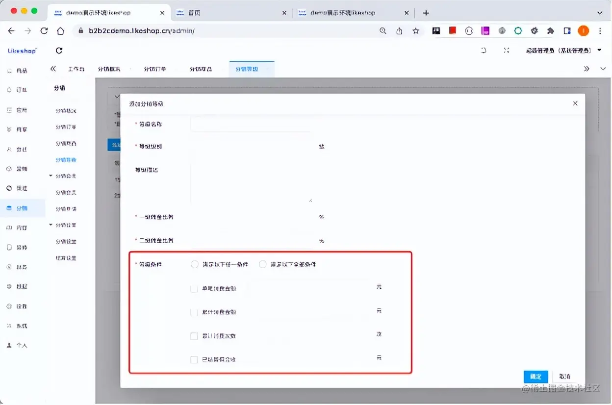点击添加分销等级按钮,可以新增分销等级。新增分销等级需要填写等级名称,等级级别,一级佣金比例,二级佣金比例,等级条件等信息。