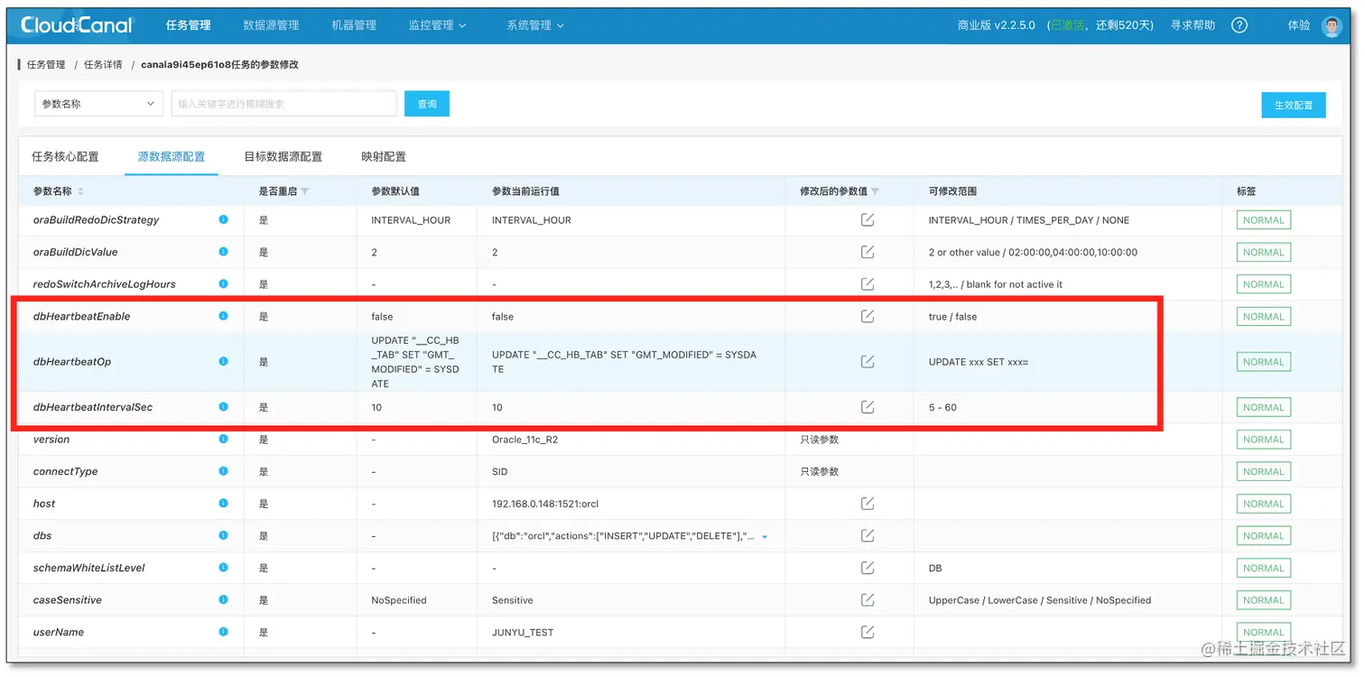 当 Oracle 一段时间完全没有变更,如何确定是任务真的延迟还是没有流量?CloudCanal 新版本参考 MySQL 源端,通过参数配置,打开心跳开关,配置好变更语句和执行间隔,即可自动进行定时变更。准确识别延迟是因为下游不行还是 Oracle 没量。