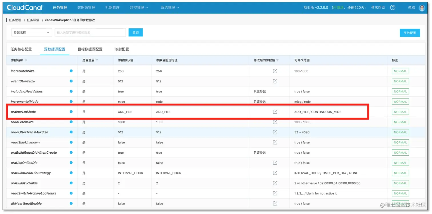 CloudCanal 对 Oracle 数据库的高权限要求,主要来自两个面向 DBA 的操作,自动构建字典 和 自动切换归档日志 , 这两个操作初心比较简单,让用户使用更加自动化和便利,但是问题也比较明显,对数据库运维标准严苛的客户来说,这些操作在某些情况下是不可接受的。 所以新版本 CloudCanal ,通过参数配置,支持了**关闭自动字典构建能力(默认打开)和关闭自动切换归档日志能力(默认关闭)。**用户在关闭这些功能时,能够知道必须辅以哪些运维操作,才能让 CloudCanal 正常运行。