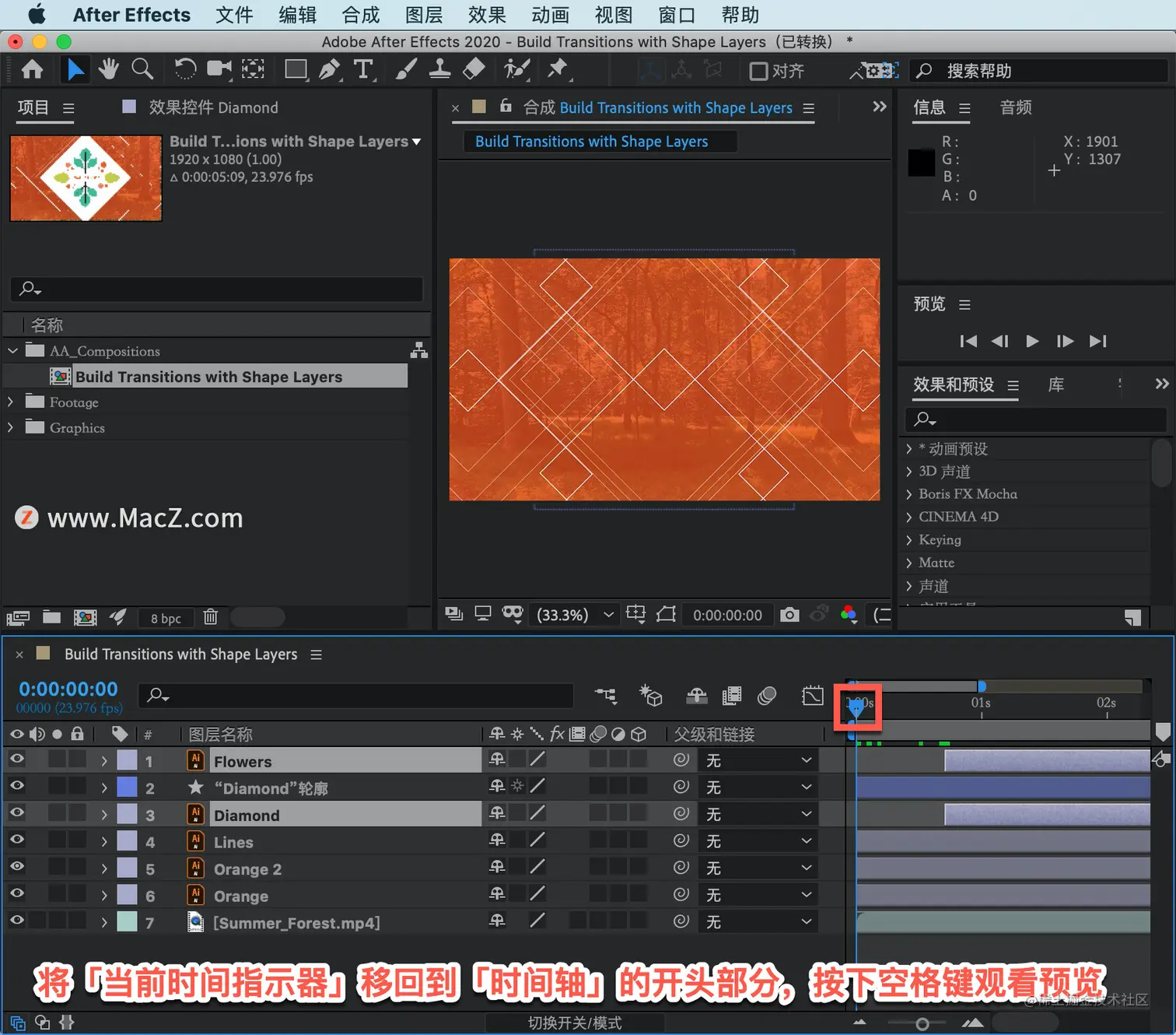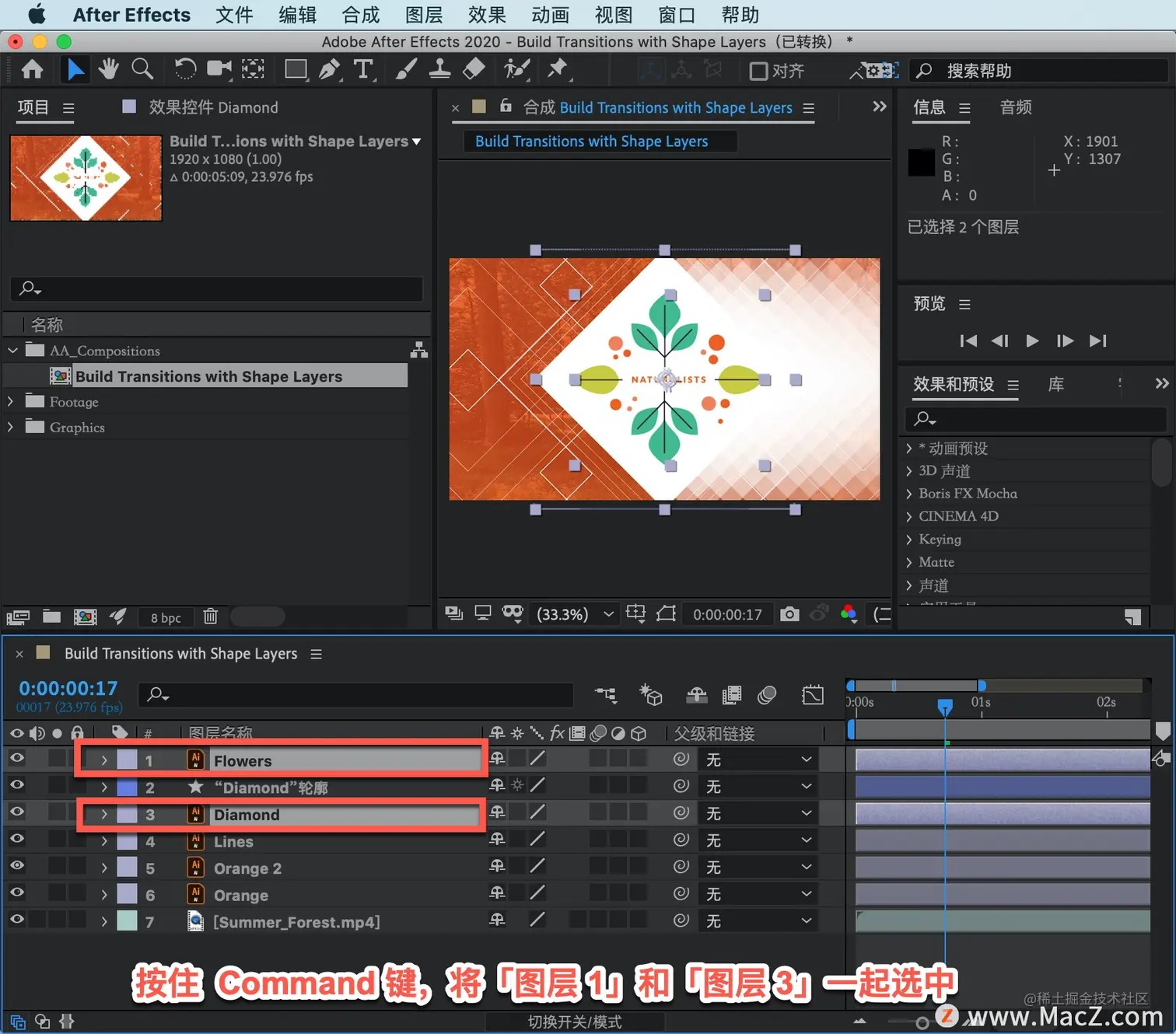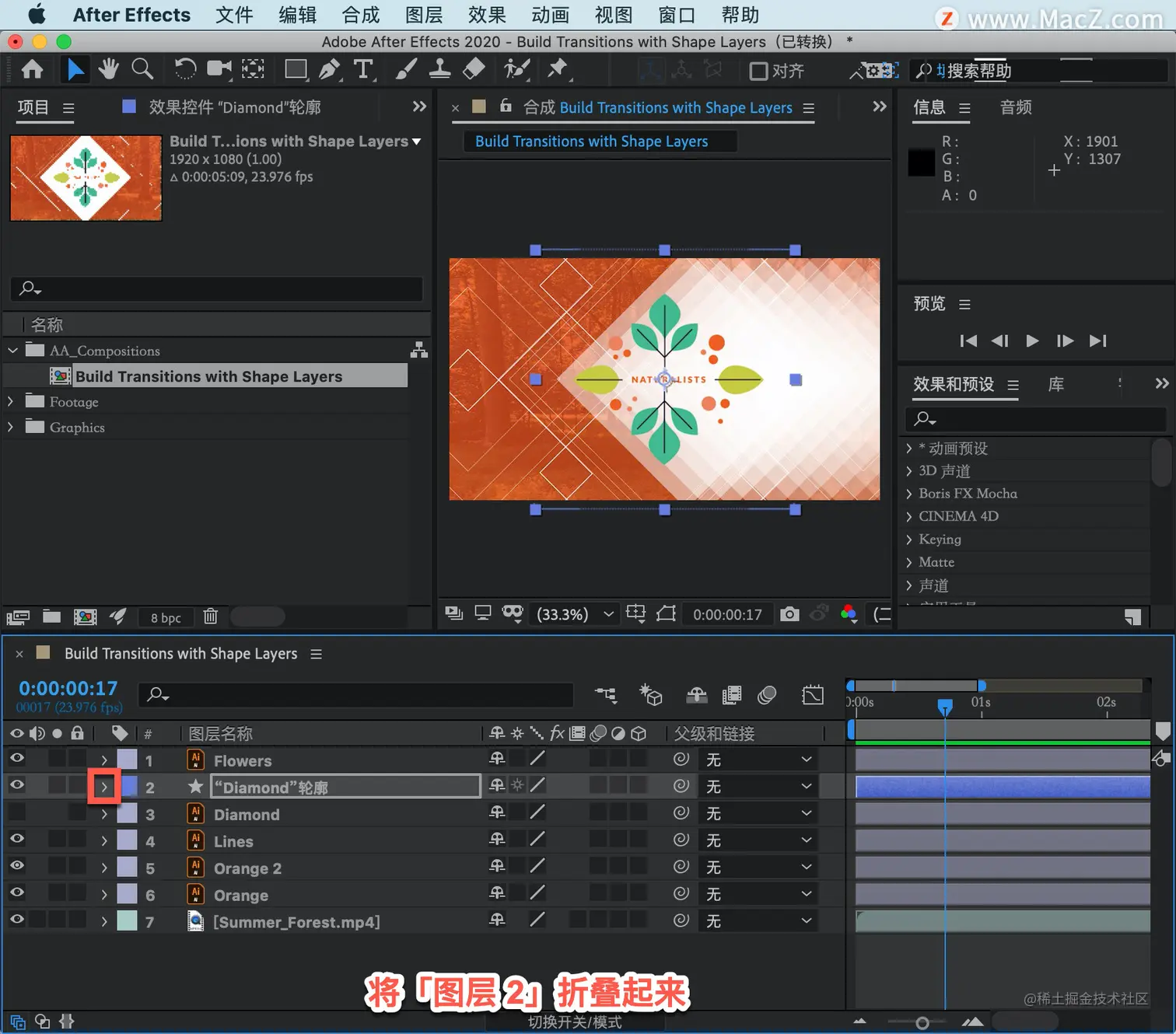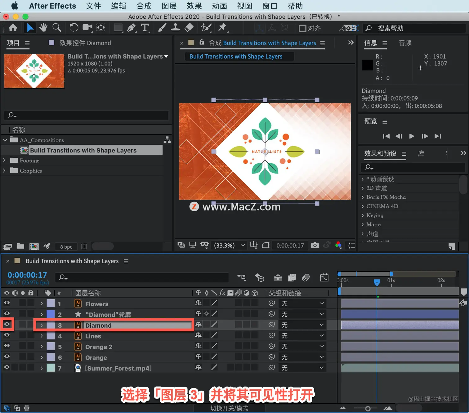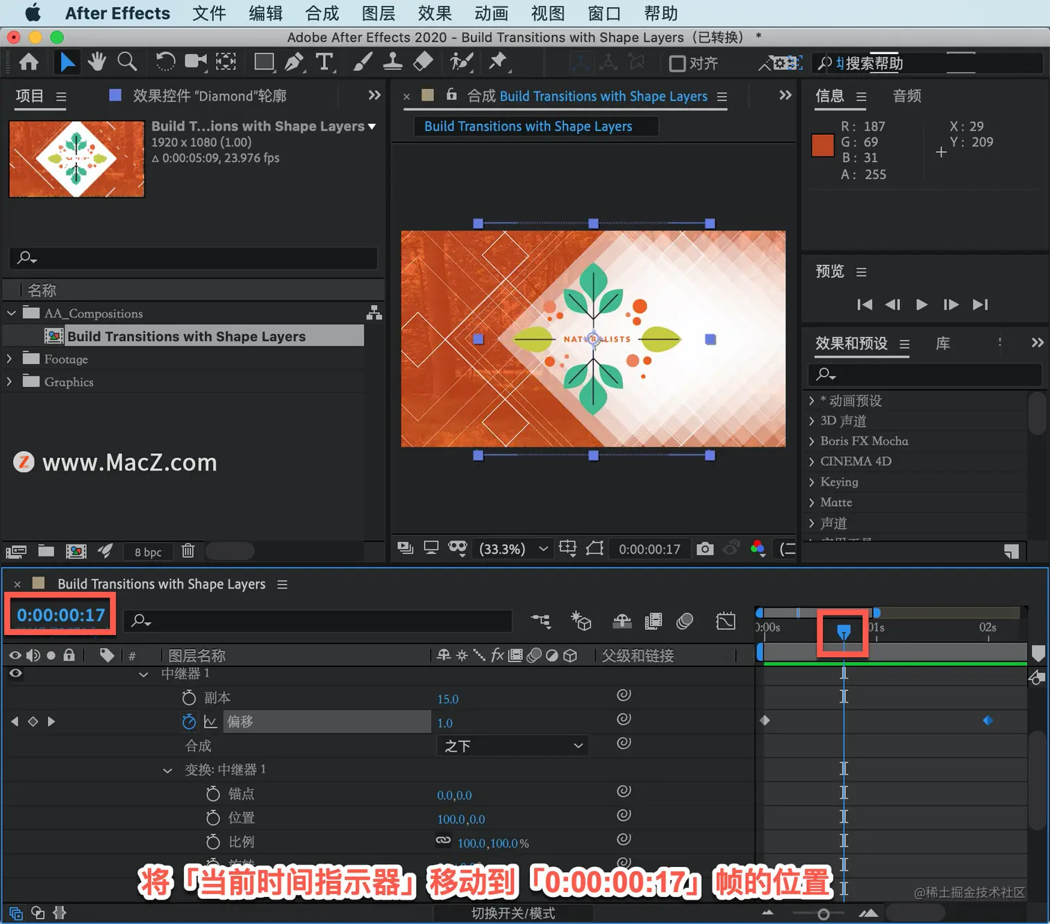 使用形状图层构建图形过渡效果后,图标后的白色背景效果很好,可以修剪图标出现的时间并且重新将白色菱形添加回背景。首先将「当前时间指示器」移动到「0:00:00:17」帧的位置。