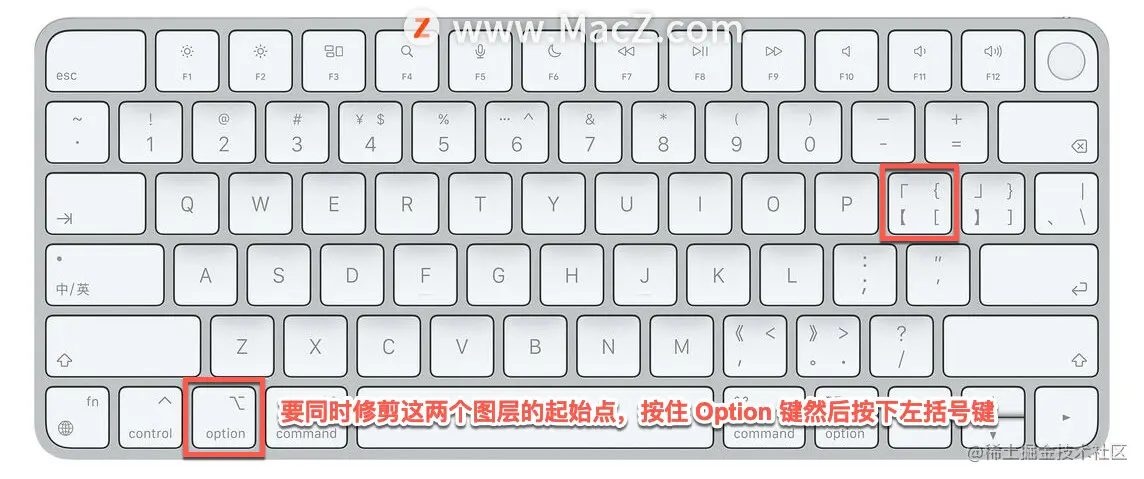 要同时修剪这两个图层的起始点,按住 Option 键然后按下左括号键,也就是键盘上字母 P右侧的键。