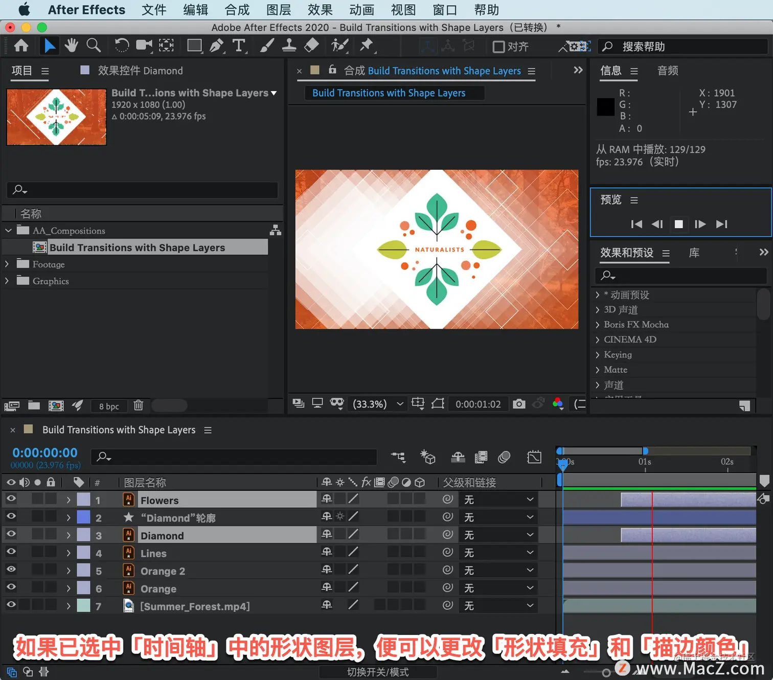 如果已选中「时间轴」中的形状图层,便可以更改「形状填充」和「描边颜色」,还能直接访问界面右上角的 「添加」按钮,而不必打开「形状图层」选项本身。