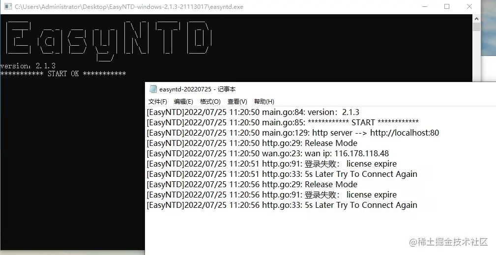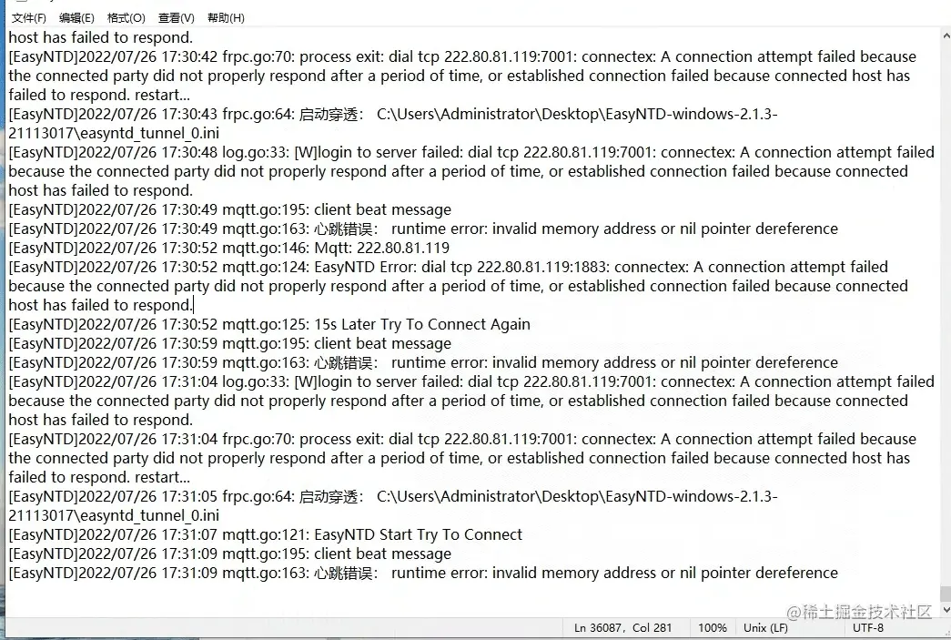 技术人员针对该情况进行了排查,猜测是否为EasyNTS授权问题导致。于是重新授权测试查看,发现设备仍然是离线状态。查看日志发现报错EasyNTD和EasyNTS通信有故障,连接异常,并且尝试连接失败。