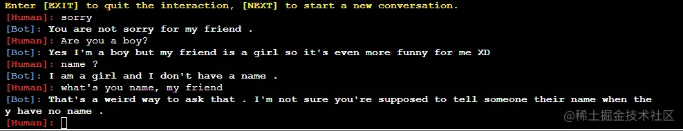 Enter [EXIT] to quit the interaction, [NEXT] to start a new conversation.