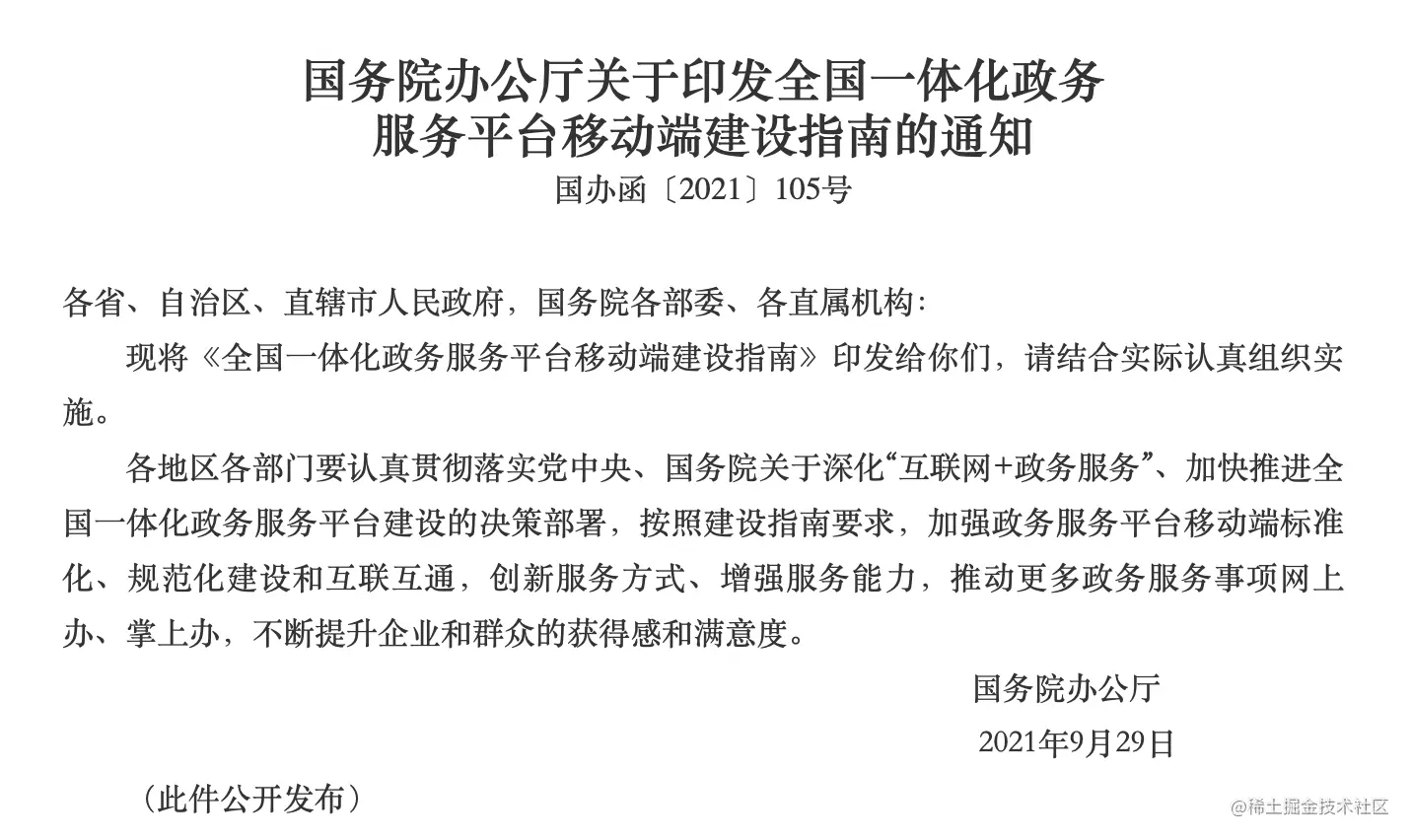 同时,2021年“数字政府建设”被写入政府工作报告,国务院办公厅印发了《全国一体化政务服务平台移动端建设指南》,全国一体化政务服务平台有了新目标——实现更多政务服务事项网上办、掌上办、一次办。