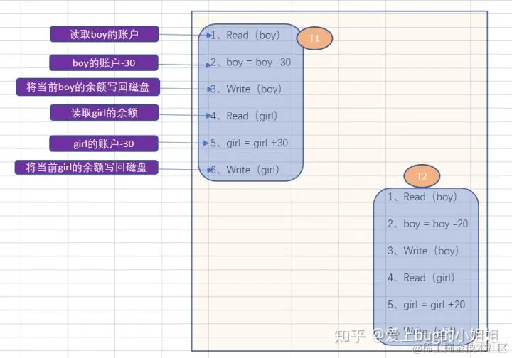 一般情况下,无论是先进行T1,还是T2,boy都可以成功转账50给girl的,毕竟30+20=50,20+30=50;但是实际上却没有这么简单,真实数据库中,T1和T2的操作可交替进行的(类比操作系统中的进程并发)。