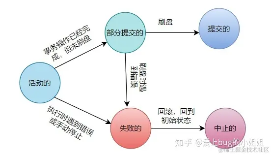 事务是一个抽象的概念,是一系列的数据库操作的集合,在它的执行过程中分为一下几种状态: