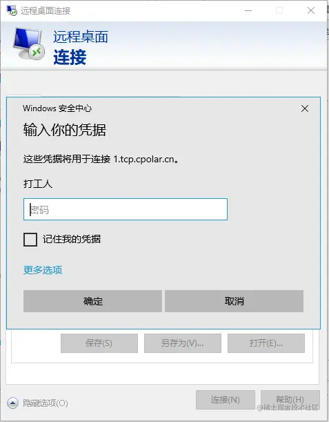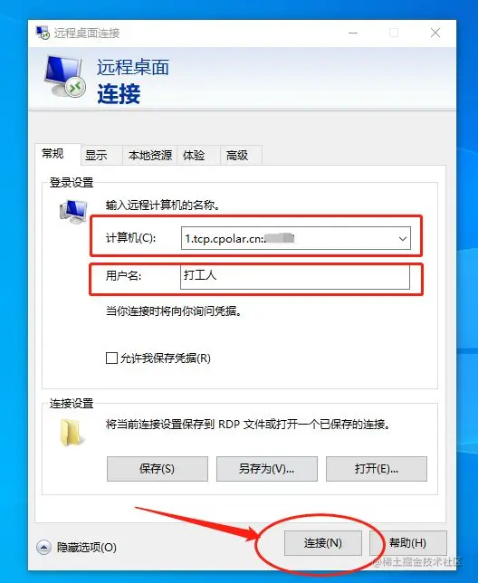 打开应用后,我们将cpolar建立的TCP隧道地址,填入远程桌面的设置中。注意,这里并不是将地址直接填入,而是要通过左下方的“显示选项”填入,否则可能会因被远程操作的用户错误,而导致远程操作失败!