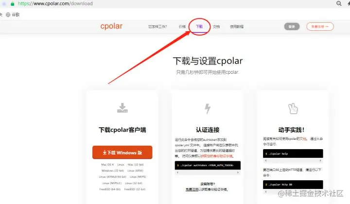 登录cpolar软件的官网(www.cpolar.com)进行注册(要使用cpolar需要先进行注册,注册程序也很简单,可以直接点击cpolar官网主页面的“注册”按钮。(cpolar官网和客户端都提供注册服务,无论在客户端还是官网注册,都可正常使用),注册完成后先下载cpolar的客户端备用。cpolar官网能够根据操作系统,自动推荐适应操作系统的客户端。