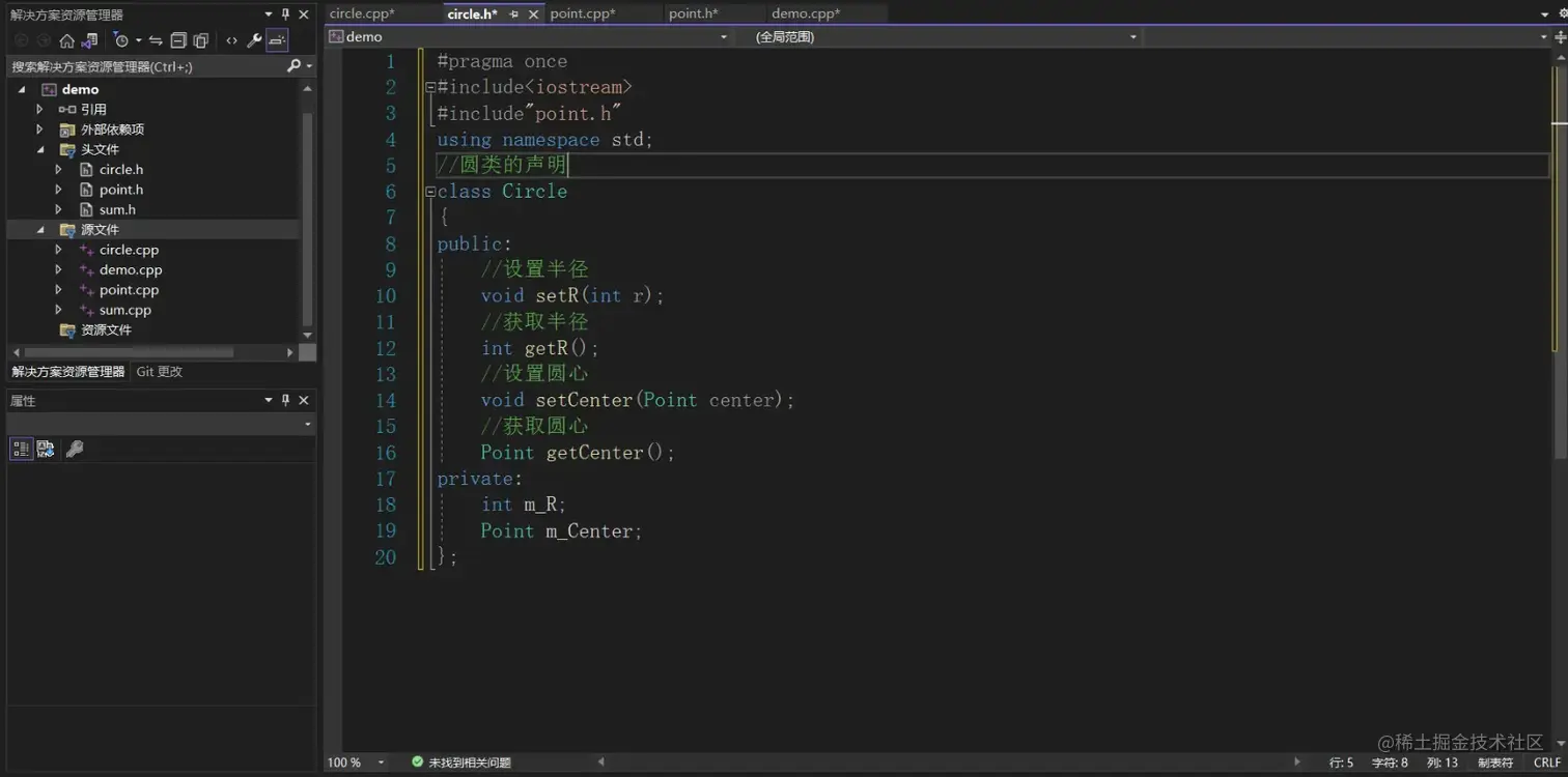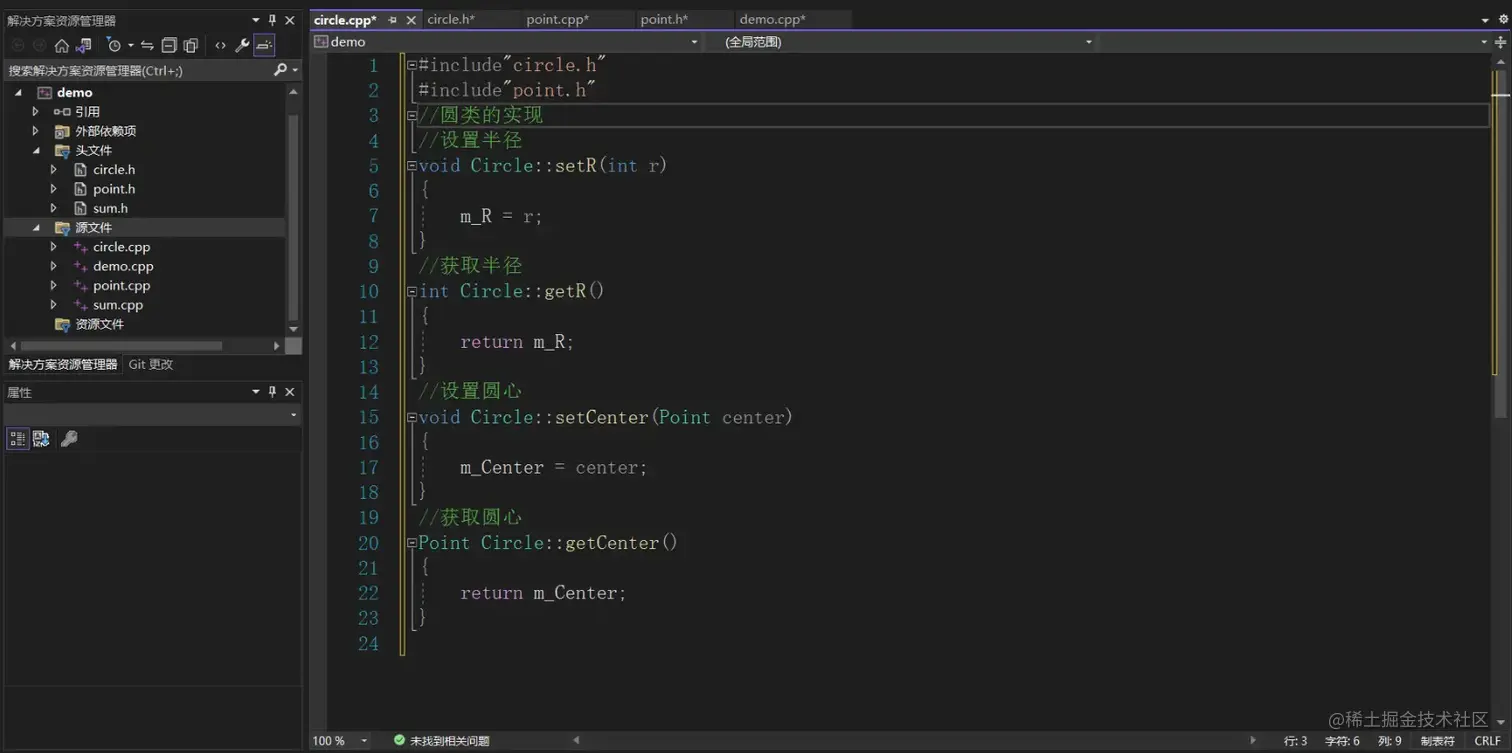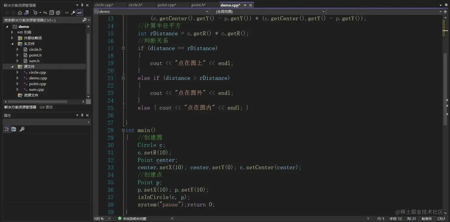 分别创建点类和圆类.h的头文件用来存放类的声明,圆类和点类的.cpp源文件存放类的实现。