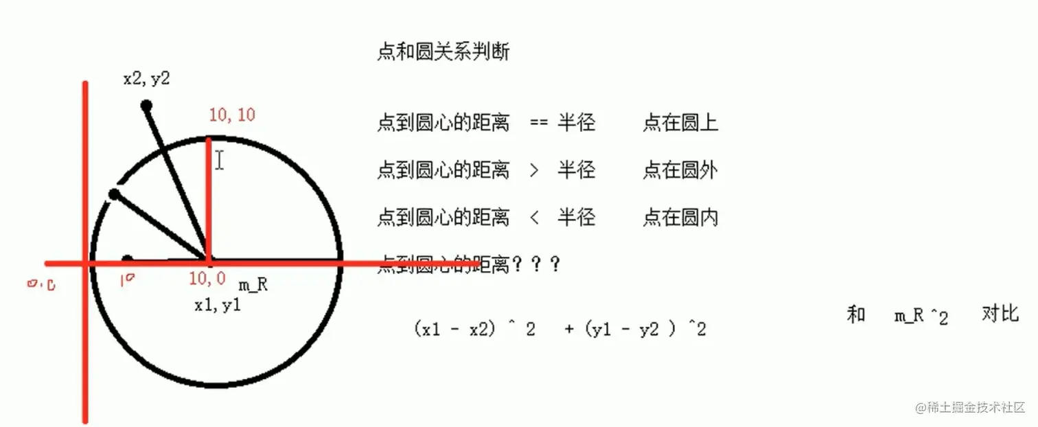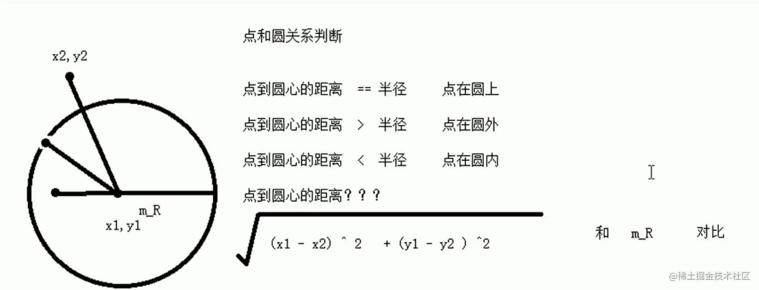 案例原理:通过比较点与圆心的距离与半径的距离来判断点与园 的位置关系。