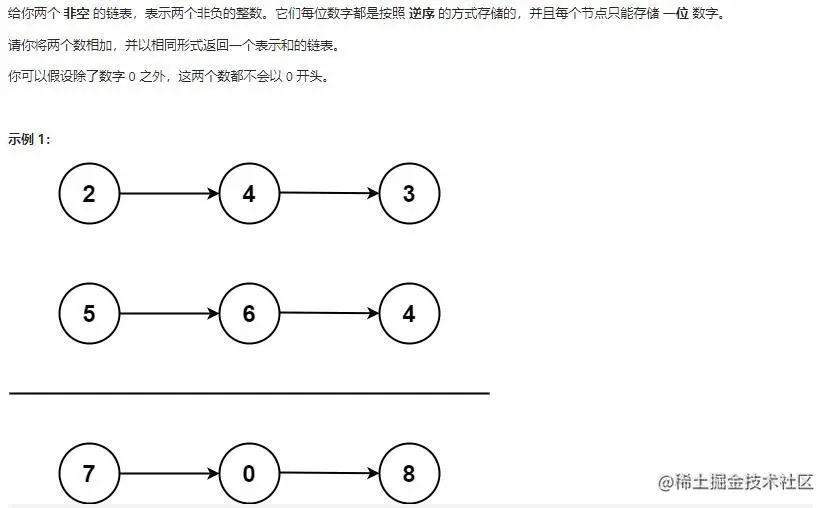 // (2->4->3)+(5->6->4) = (7->0->8),根据加法的计算过程我们知道首先从低位开始算起,也就是说应该先计算2+5=7.