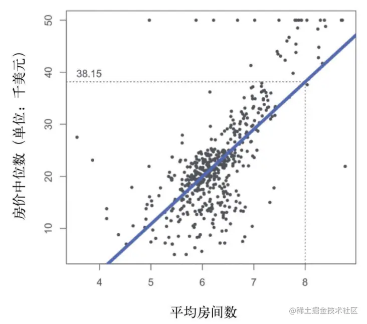 在图中,我们可以看到房间数与房价的大致关系,并绘制一条趋势线,根据这条趋势线,我们大致可以预测,有8个房间的房子,单价大概率在 38.15 附近。