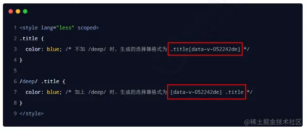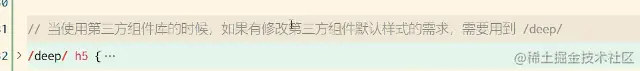 如果给当前组件的 style 节点添加了 scoped 属性,则当前组件的样式对其子组件是不生效的。如果想让某些样式对子组件生效,可以使用 /deep/ 深度选择器
