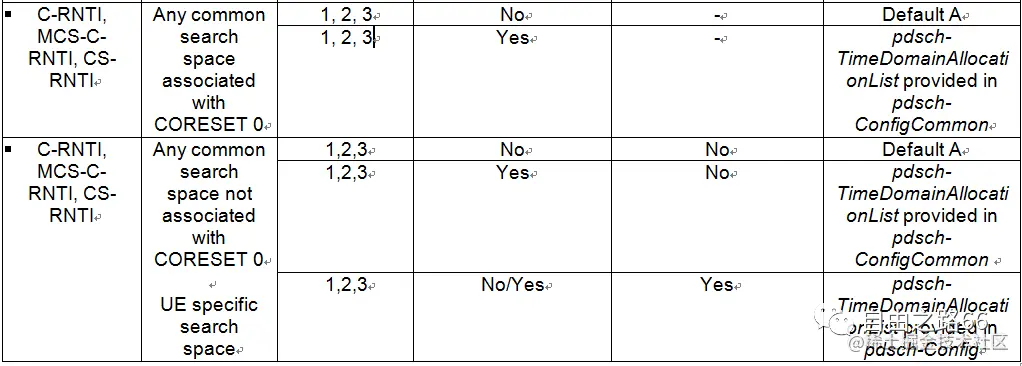 对于C-RNTI/CS-RNTI/MCS-RNTI,还需要参考PDSCH-Config中pdsch-TimeDomainAllocationList是否配置以及DCI所处的搜索空间和CORESET。
