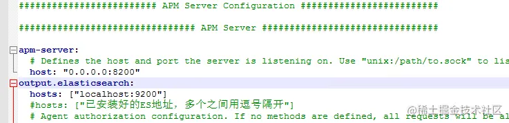 将配置文件最开始的host: “localhost:8200”修改成“0.0.0.0:8200”,以便让他能允许通过ip:端口号的方式访问。然后增加elasticsearch地址配置: