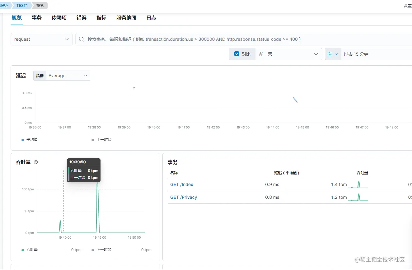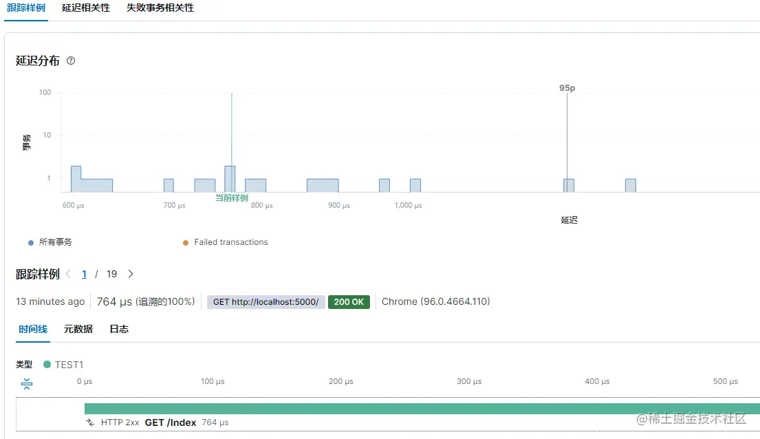 点击【事务】,这里的【时间线】就有我们请求的链路跟踪,即微服务所需的链路跟踪功能。