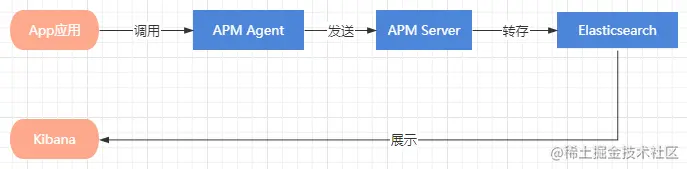 Elastic APM实现链路追踪,首先要引用开源的APMAgent(APM代理),然后将监控的信息发送到APMServer,然后在转存入ElasticSearch,最后有Kibana展示;具体流程如下图所示: