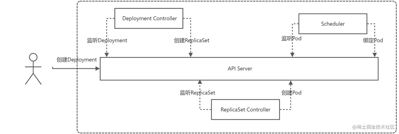 下面就是Deployment Controller和ReplicaSet Controller两个控制器的工作流程。