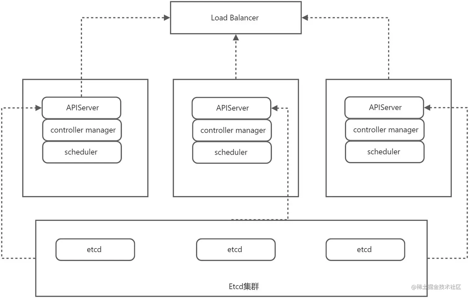 (1)将Master节点从单节点变成了多节点,在kube-apiserver前增加了load balancer用来负载,其他组件通信都是通过LB进行