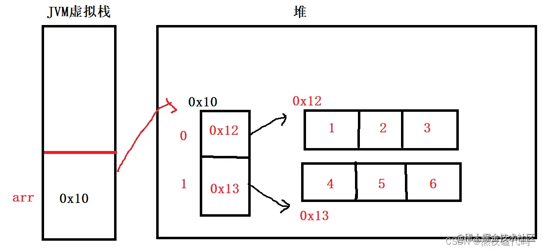 从上图可以看出,引用变量并不直接存储对象本身,而是存储对象在堆中的起始地址,通过此地址去访问数组.