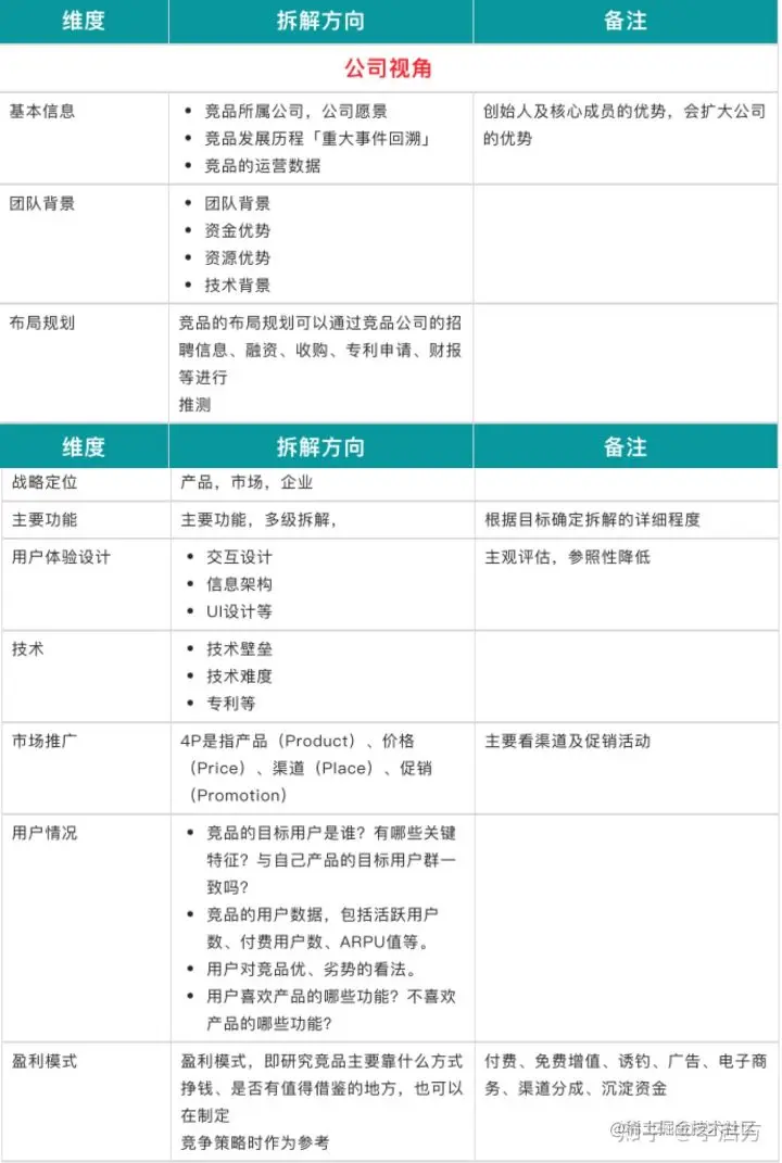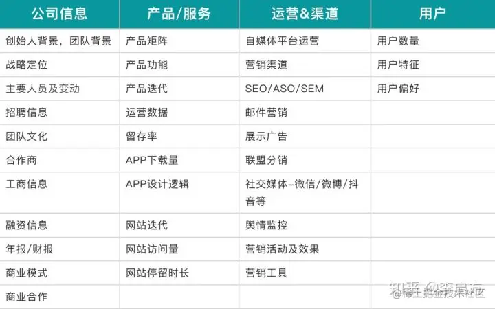 只要企业与⽤户有过接触,就会留下痕迹,我们就按照产品/服务,⽤户,运营&渠道,公司(组织架构)这4个⻆度收集竞品信息。