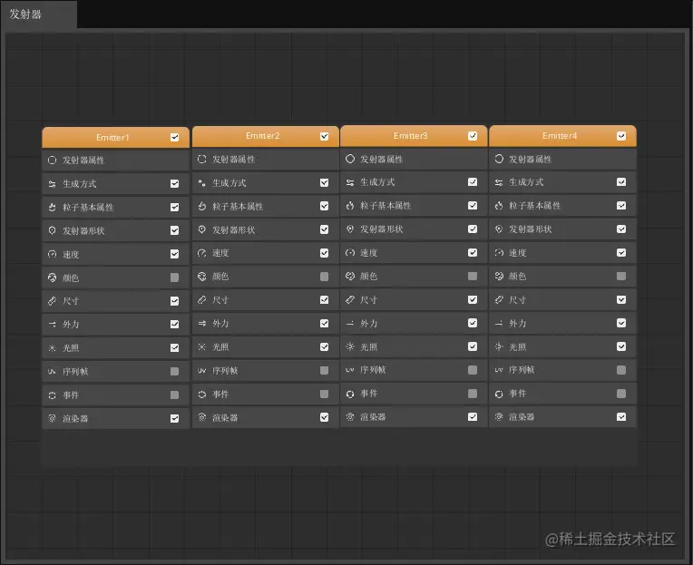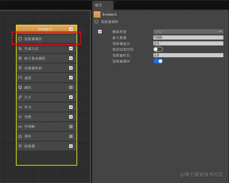 点击发射器节点中的“发射器属性”属性分类后,按照下图设置发射器属性参数。