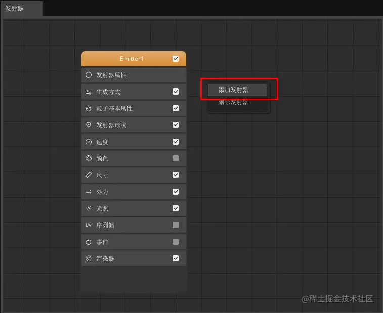首先我们在“发射器”窗口中鼠标右击,点击“添加发射器”添加一个新的发射器。