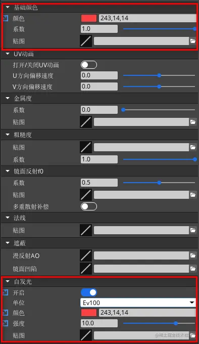 ·自发光:使用自发光属性,需要先打开“开启”开关。颜色使用方式与基础颜色属性类似,强度决定了自发光的强度。