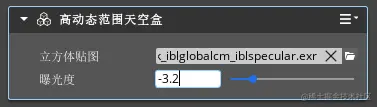 2、我们需要模拟一个较暗的环境:选中“实体大纲”窗口默认环境组中的天空,在引擎首页右侧的“组件属性”窗口中找到高动态范围天空盒组件,并调整曝光度属性至-3.2。