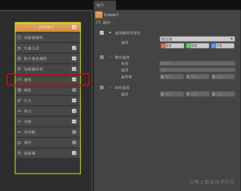 点击发射器节点中的“速度”属性分类,设置Z轴速度为7.0。