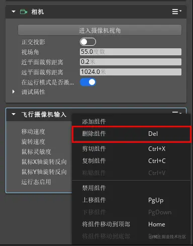 7、在“组件属性”窗口中找到“飞行摄像机输入”组件,鼠标右击该组件,并将其删除。