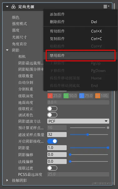 3、选中“实体大纲”窗口默认环境组中的太阳,在引擎首页右侧的“组件属性”窗口中找到定向光源组件,并鼠标右击该组件,点击“禁用组件”。