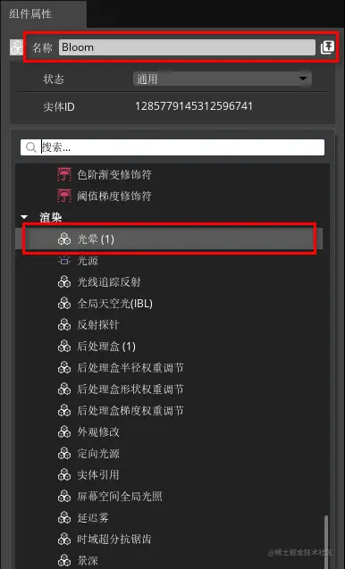 5、在“实体大纲”窗口中选中新创建的实体,在组件属性中重命名为“Bloom”,并添加一个“光晕”组件和“后处理盒”组件来加强烟花粒子的光效。
