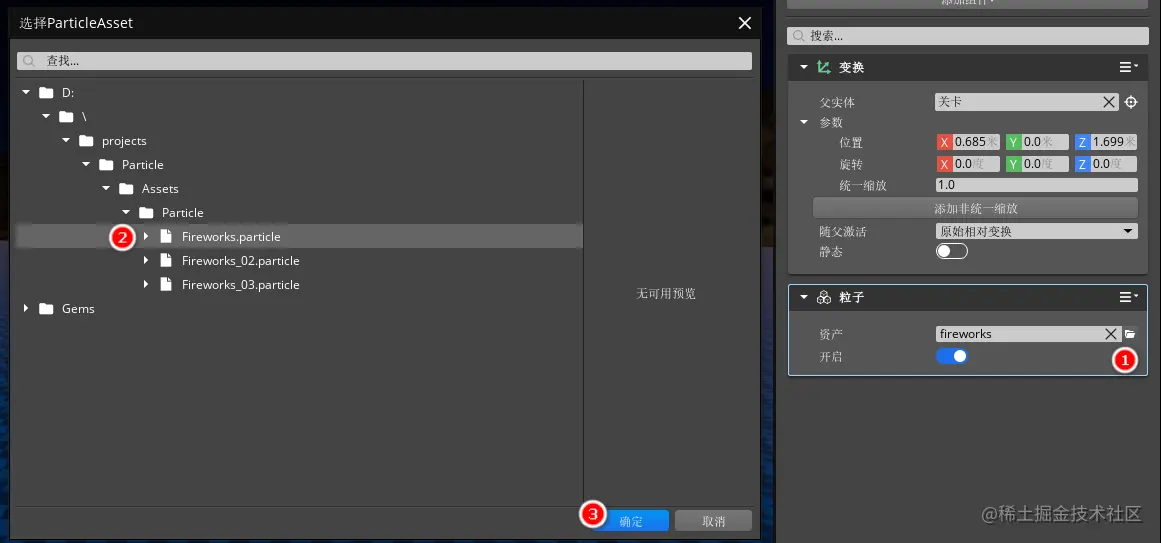 3、在“粒子”组件中,指定我们保存的粒子文件,并打开“开启”按钮,这里我们可以为每个实体随机指定“Fireworks”、“Fireworks_02”和“Fireworks_03”粒子文件。