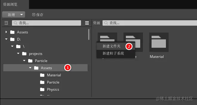 2、在粒子编辑器中的“资源浏览”窗口中找到工程目录中的“Assets”文件夹,点击选中后在浏览模板中鼠标右击并点击“新建文件夹”,命名为“Particle”。