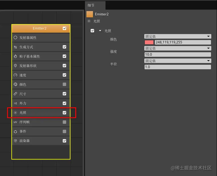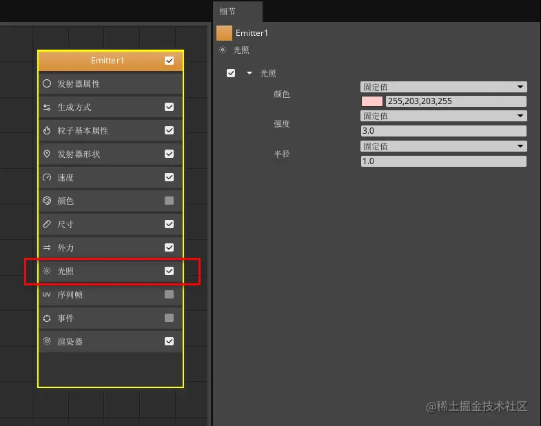 点击发射器节点中的“光照”属性分类,勾选光照,并按照下图参数进行设置。