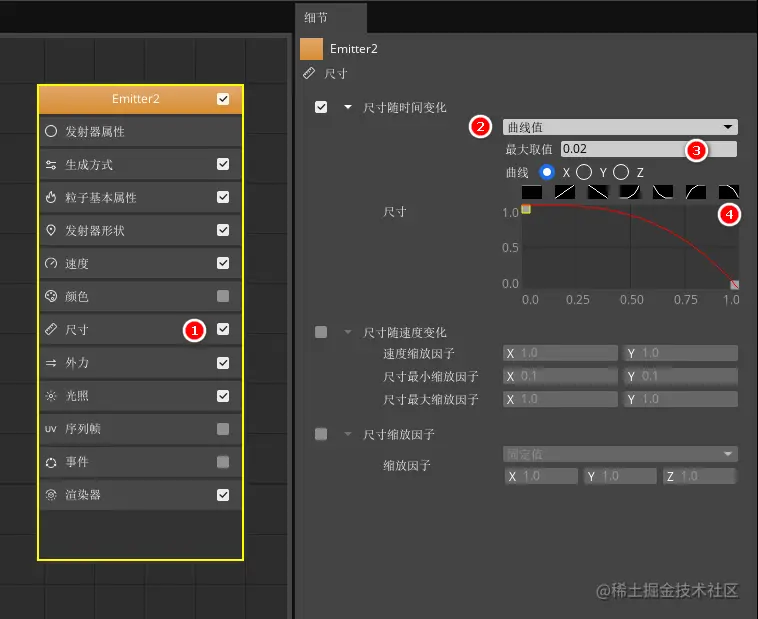 点击发射器节点中的“尺寸”属性分类,勾选“尺寸随时间变化”,选择类型为曲线值,并按照下图设置X、Y、Z的最大值和曲线。