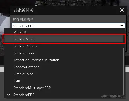 3、在弹出的窗口中选择材质类型为“ParticleMesh”,并在工程目录中的Assets文件夹中新建一个“Material”文件夹,将材质保持到此文件夹中,重命名为“Particle”。