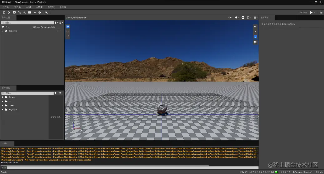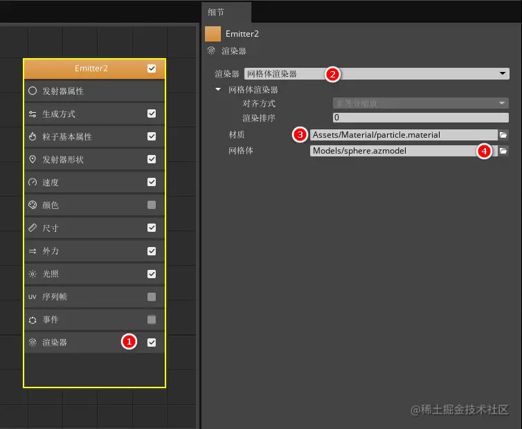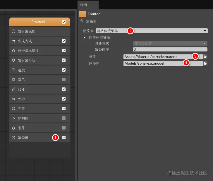 点击发射器节点中的“渲染器”属性分类,选择渲染器为“网格体渲染器”,并在“Assets > Material > Particle.material”目录中找到我们在材质编辑章节中保存的材质进行指定。