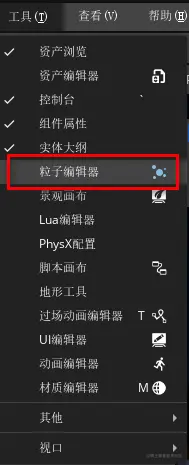1、返回引擎首页,在全局菜单栏中点击“工具 > 粒子编辑器”打开粒子编辑器。