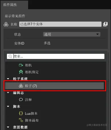 2、在“实体大纲”窗口中多选新建的7个实体后,在“组件属性”窗口在为其添加“粒子组件”。