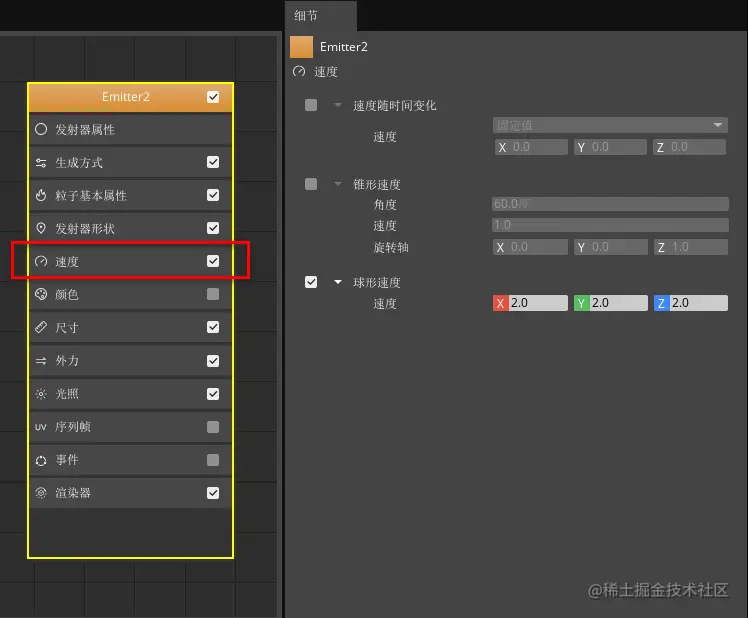 点击发射器节点中的“速度”属性分类后,按照下图设置速度参数。
