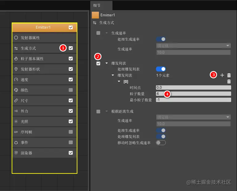 点击发射器节点中的“生成方式”属性分类,勾选使用“爆发列表”生成方式,并在爆发列表中添加一个元素设置粒子数量为4。