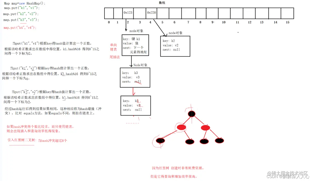 Hashmap得原理,存储元素使用得put(key,value),根据key得hash计算出相应得哈希值,根据相应得算法求出该元素在数组中得位置, 如果求出得哈希值相同,则称为哈希冲突,会根据equals来判断元素是否一致,如果equals不同,则存入单向链表上, 如果哈希碰撞得个数超过8个,则把链表转换为红黑二叉树。