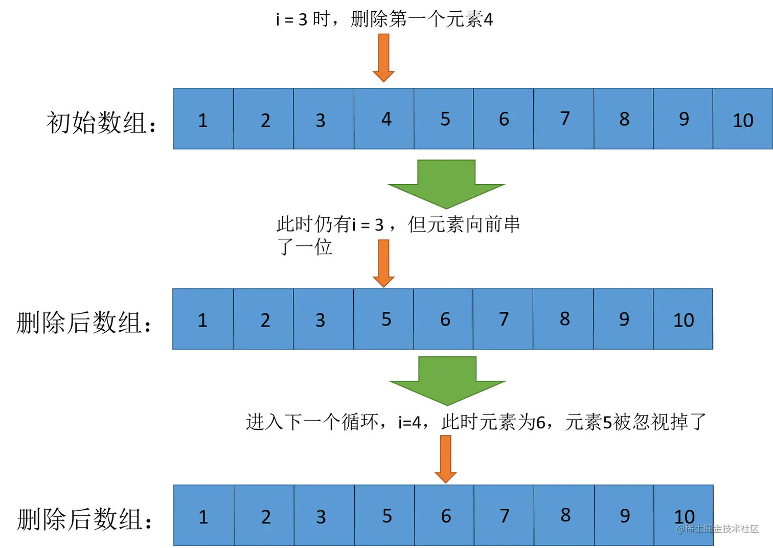 我们要知道 splice 方法会改变原始数组,当我们删掉一个元素后,会发生串位现象,下面这个图可以说明。