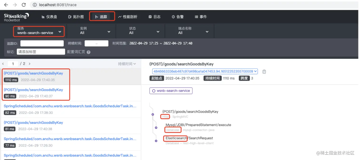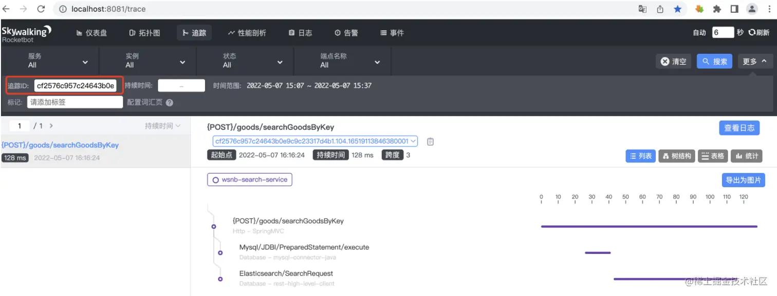 效果:可以看到一次请求经过了http、db、es等链路。以及相应的执行时间。